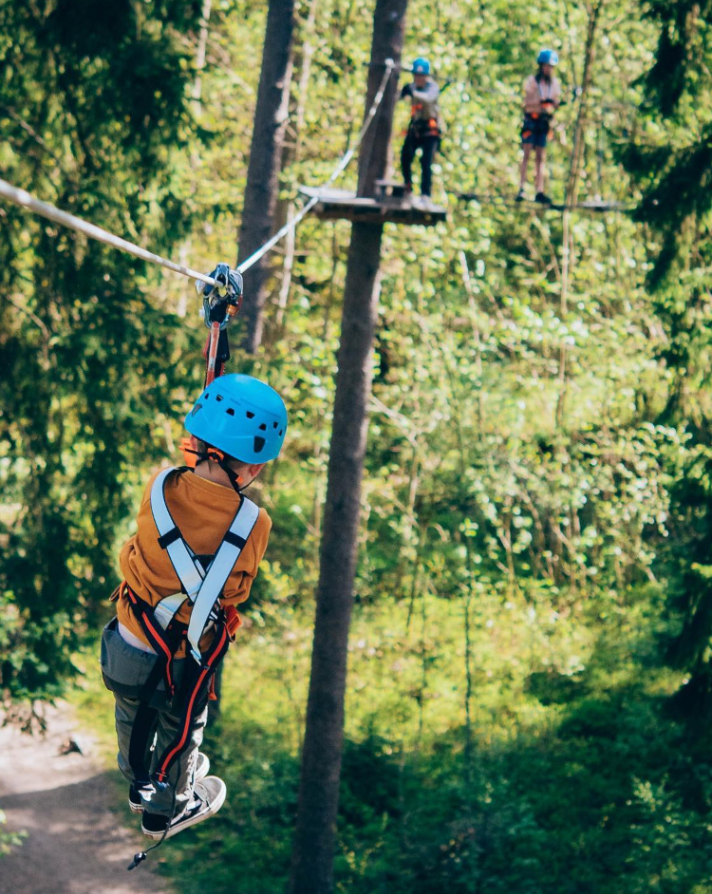 Våra banor är uppbyggda i olika svårighetsgrader, vilket gör att alla kan vara med – oavsett om det är första gången eller om man redan älskar höjd och fart. Här finns balansmoment, repbroar, nät och fartfyllda ziplines som gör kalaset varierat och fullt av små äventyr längs vägen.