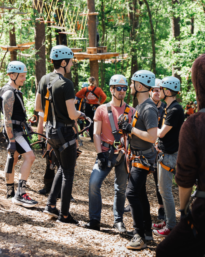 Er upplevelse börjar med incheckning, påselning och en säkerhetsgenomgång i vår Introzone. Här får ni testa hinder och ziplines på lägre höjd innan ni ger er upp i banorna.
